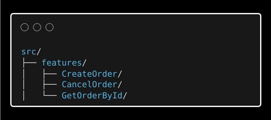 Vertical Slice Architecture is a different axis entirely — not just more modularity, but a different way of drawing the lines. Where the module pattern groups by domain concept (orders/), vertical slices group by user action (CreateOrder/, CancelOrder/). Each folder is a complete feature from top to bottom.