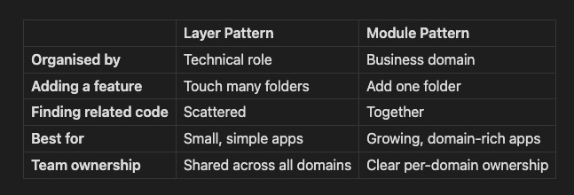 If you are starting a new project today with any expectation of it growing, just start with modules. The “but my domain is still fuzzy” argument is real but overstated — you can always rename a folder. What you cannot easily undo is a layer-structured codebase with forty files per folder and a team of eight all touching the same directories for every feature.