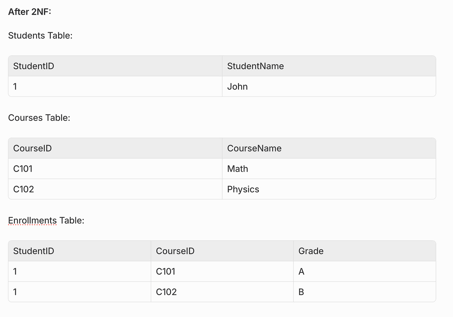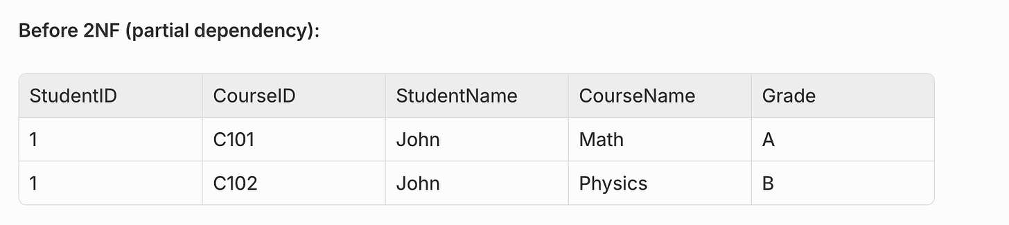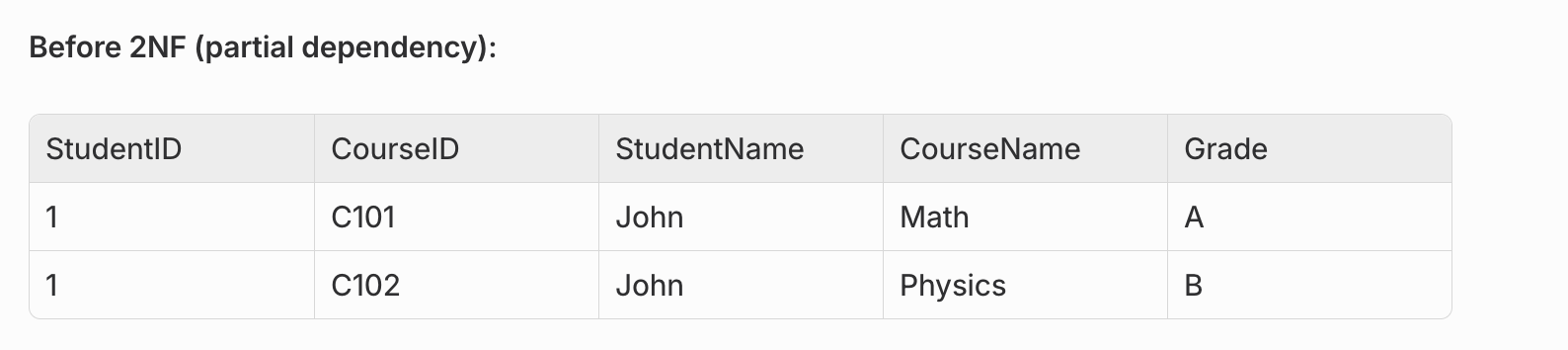 Problem: StudentName depends only on StudentID (part of the composite key), not on the full key (StudentID, CourseID).
