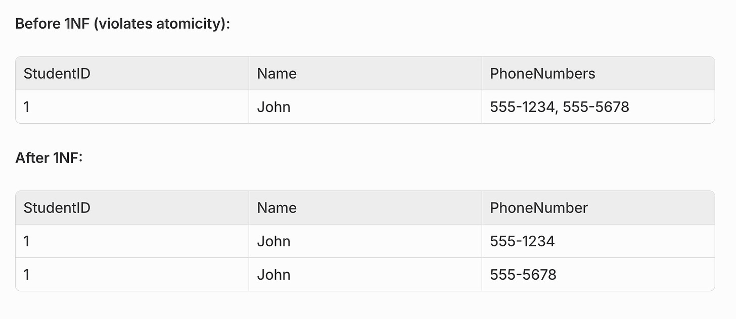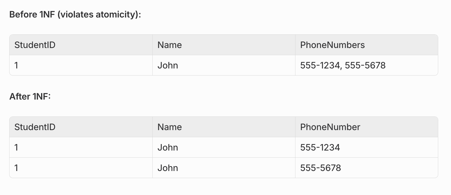 Rule: Each column must contain atomic (indivisible) values. No repeating groups or arrays.