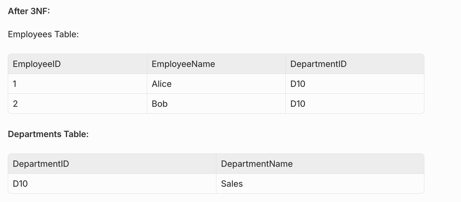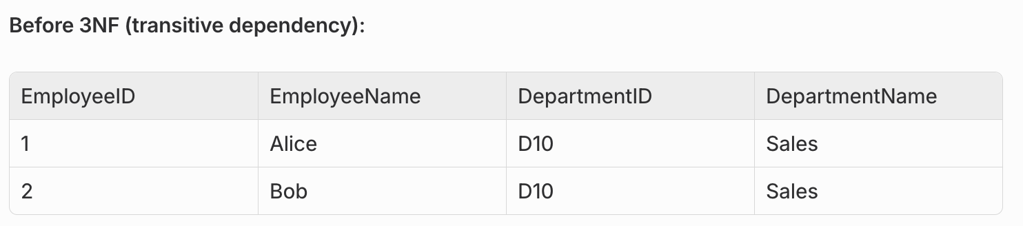 Problem: DepartmentName depends on DepartmentID, which depends on EmployeeID (transitive dependency).