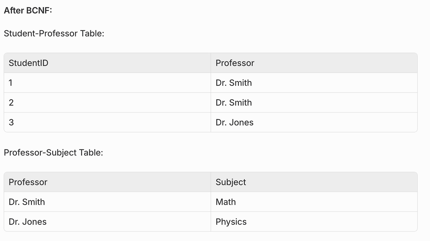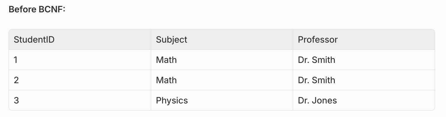 Problem: Professor determines Subject (each professor teaches only one subject), but Professor is not a candidate key.